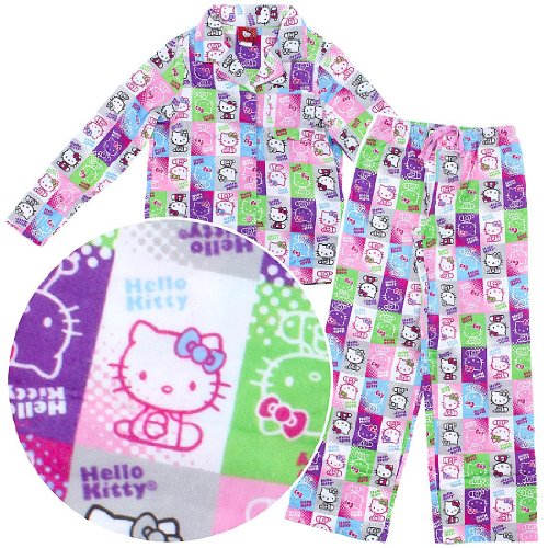 These flannel pajamas feature Hello Kitty. The fabric is 100% cotton flannel. The top buttons up the front.